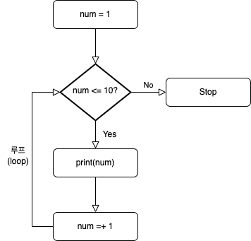 num += 1 # num에 num+1 을 할당 → 루프를 타고 올라가서 while 조건 충족 여부 재확인