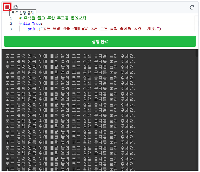 -코드 블럭 왼쪽 위에 ■을 눌러 코드 실행 중지를 눌러 주세요.