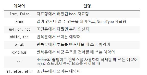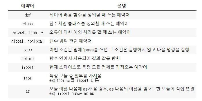 여기서 중요한 것은 예약어는 절대로 변수명으로 쓰일 수 없다는 것입니다. 이는 파이썬을 포함하여 어떤 언어를 배울 때도 동일한 규칙입니다.