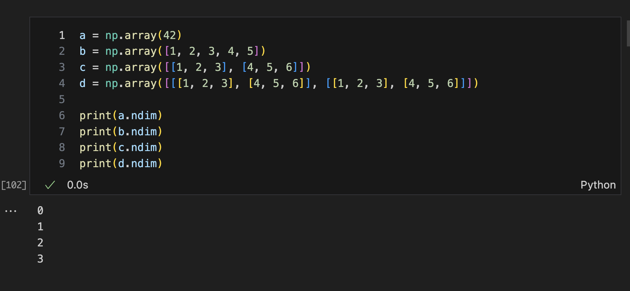 - 주어진 입력 리스트는 이미 9차원의 중첩을 가지고 있으므로 ndmin=5는 추가적인 영향을 미치지 않는다.