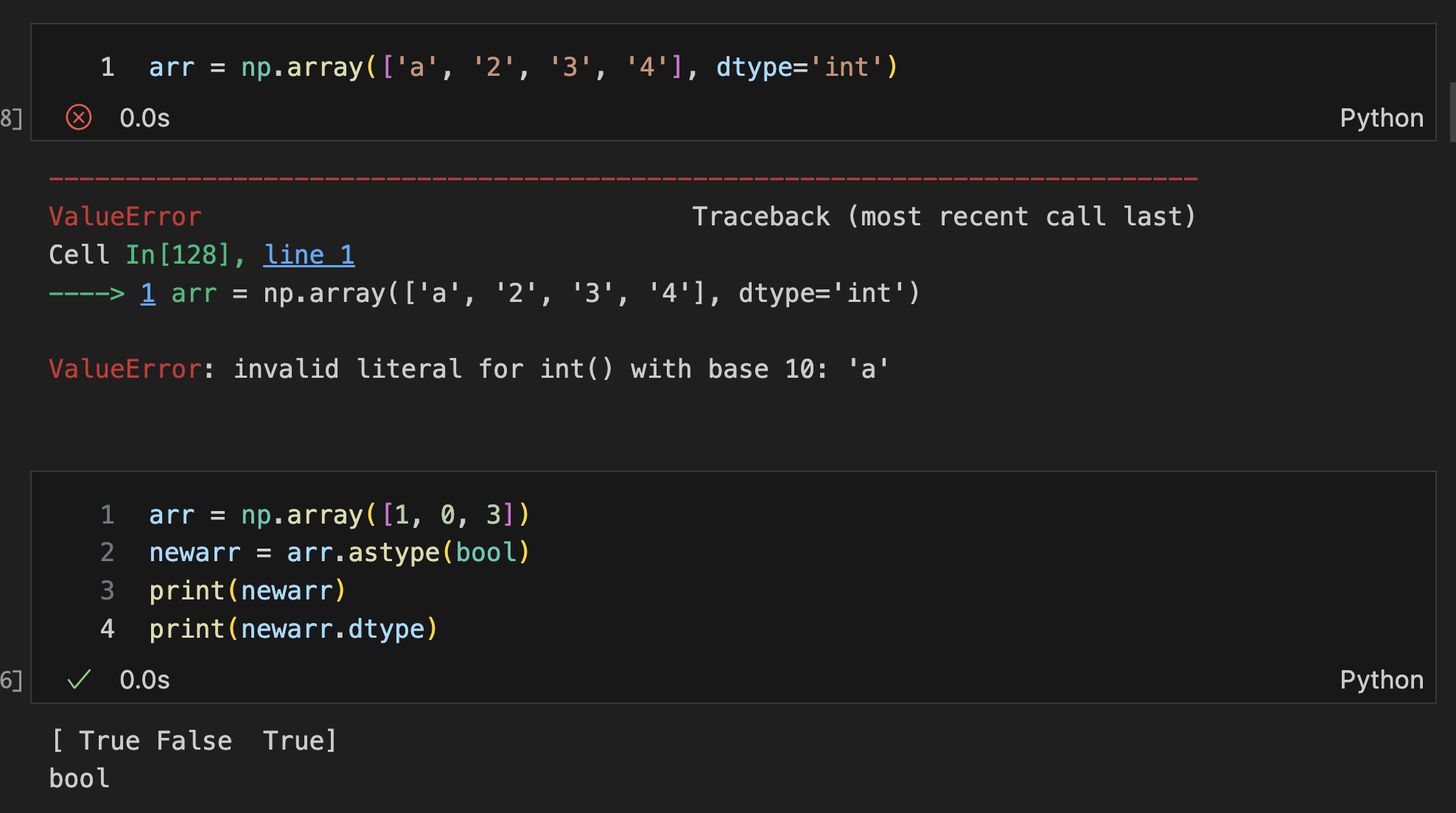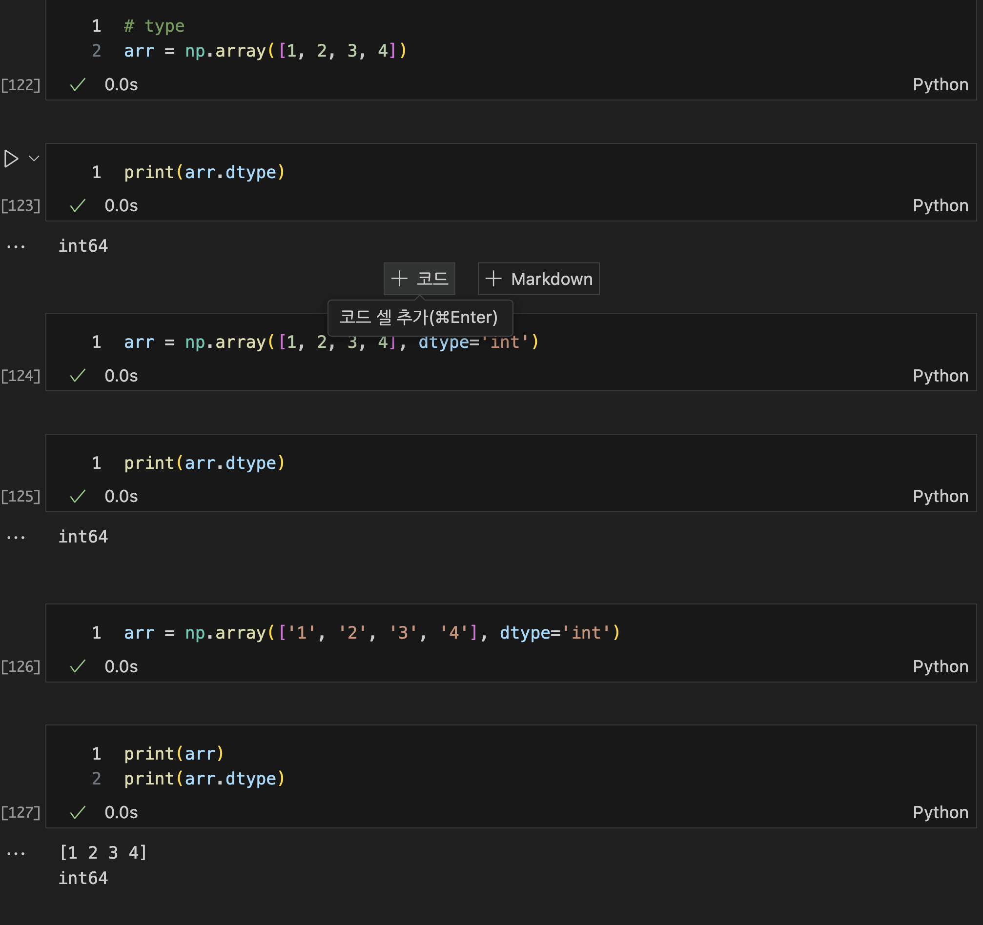 -astype함수로 타입을 바꿀 수 있다. (위의 예시에서는 새 변수 newarr에 지정해줬지만, arr.astype해도 가능하다.