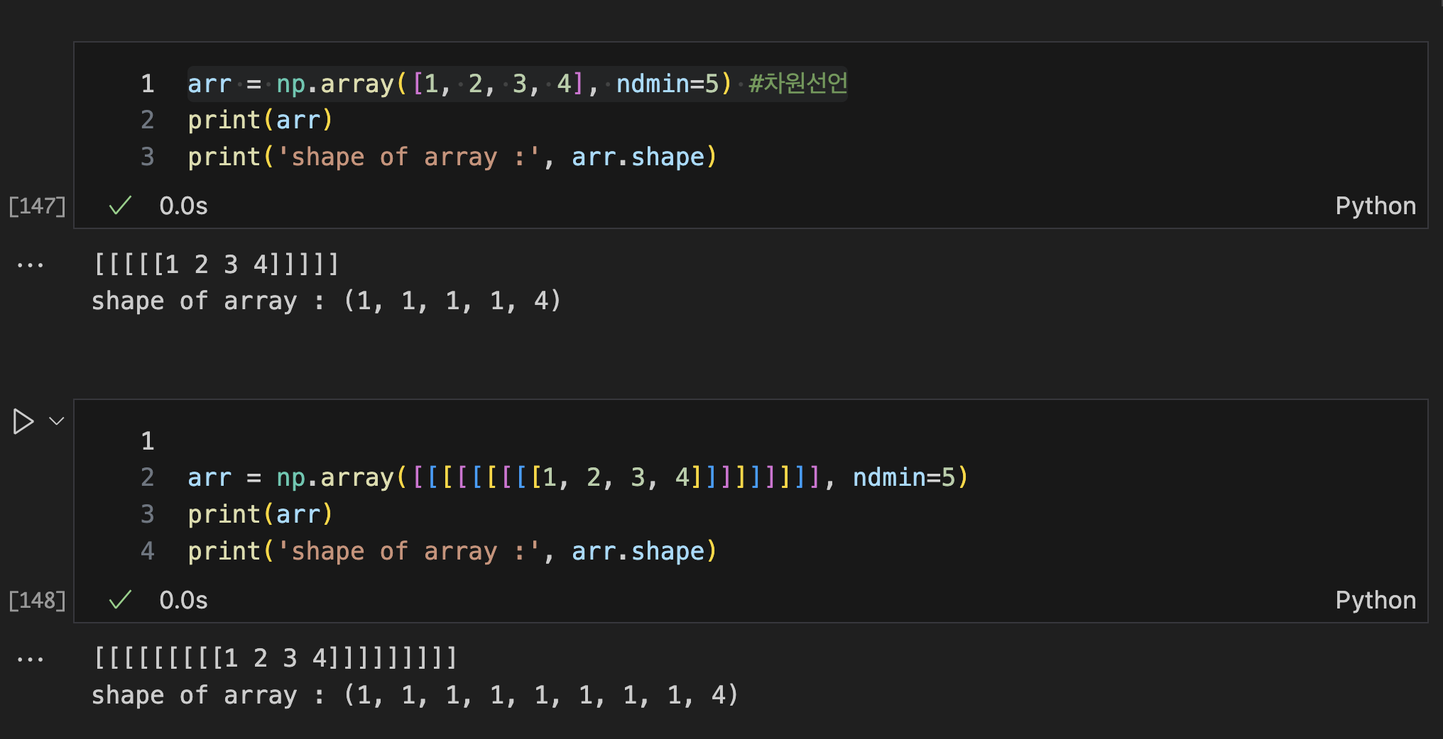 - 첫 번째 코드는 [1, 2, 3, 4]라는 1차원 리스트를 최소 5차원으로 확장하여 (1, 1, 1, 1, 4) 모양을 가집니다.