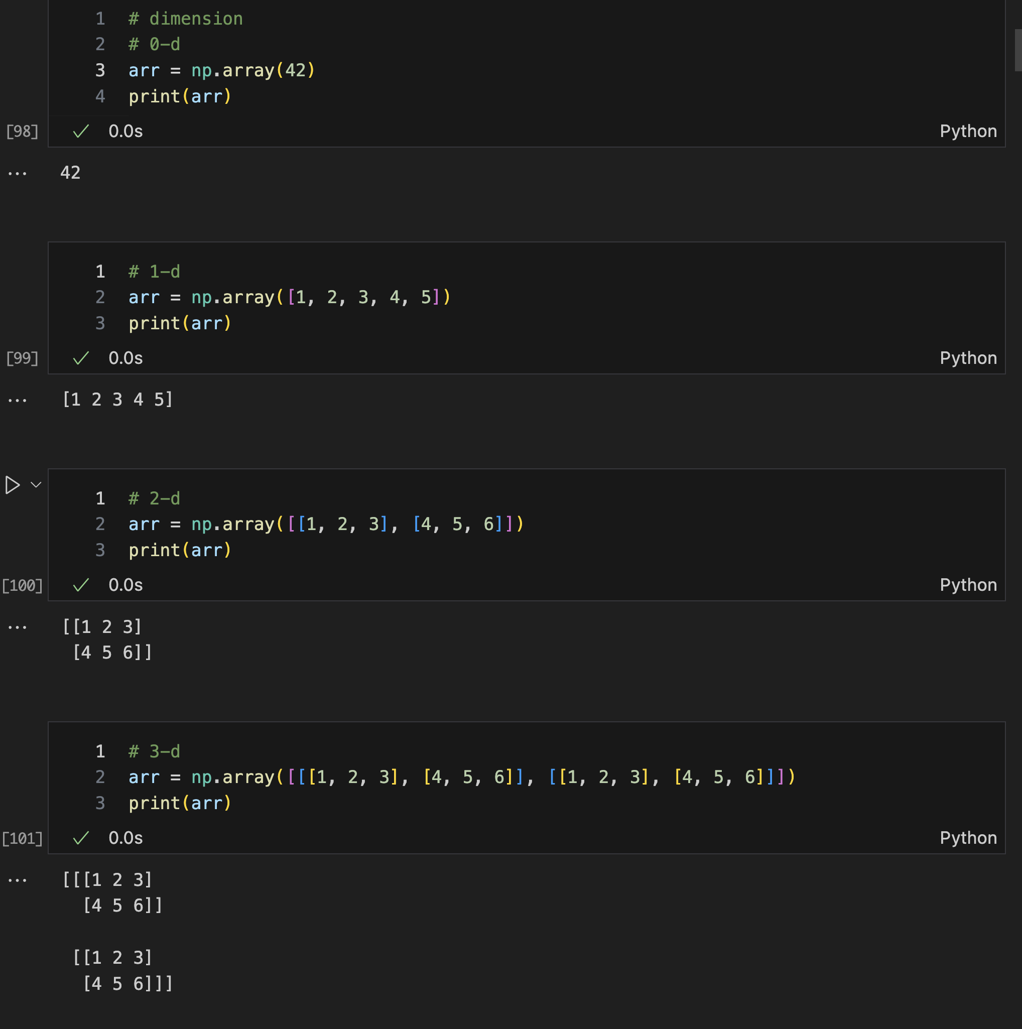 -첫번째 예시; ndmin=5를 사용하여 최소 5차원 배열을 만들고, 입력 리스트 [1, 2, 3, 4]는 1차원 리스트이지만 최소 5차원을 강제로 적용한다.